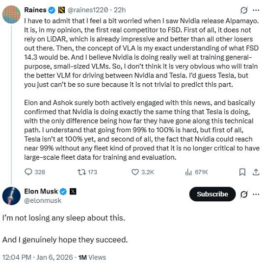 马斯克面对英伟达新推出的自动驾驶模型Alpamayo,展现出近乎“佛系”的淡定,他微笑着表示:“我才不会因为这个失眠呢。”